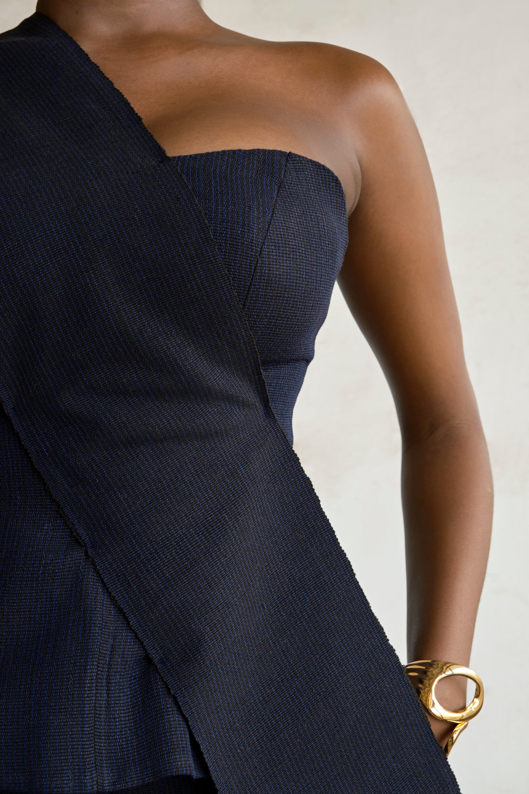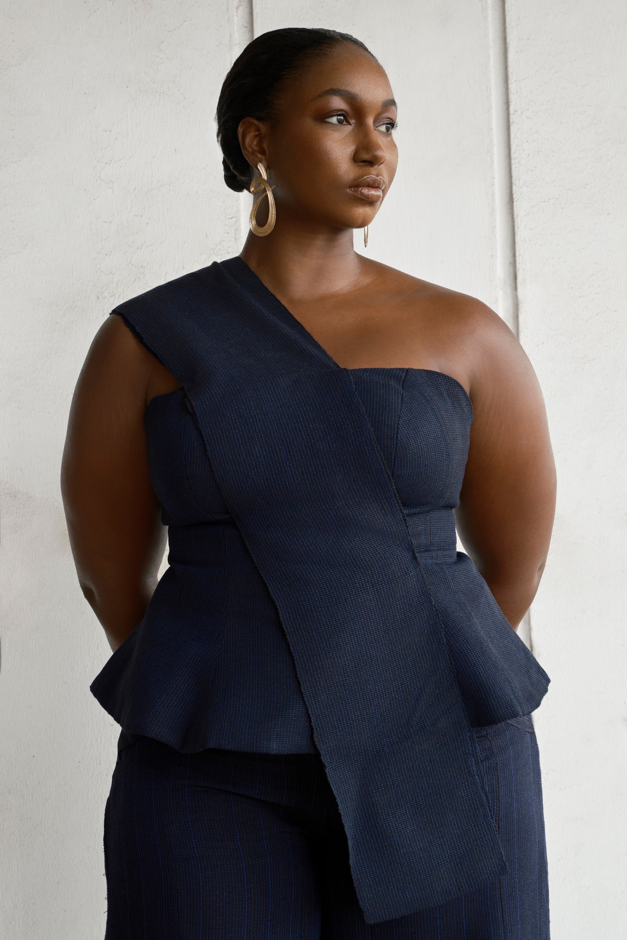 The top is constructed with iconic indigo dyed aso-oke strips known as Etu, in a weave that echoes the Nigerian version of a hand woven delicate pinstripe. Each strip is unique, with delicate variations in the stripes making each top one of a kind.
